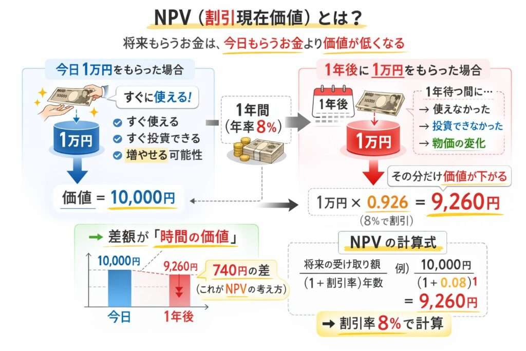 ためだから、1年後の10,000円は、今日の10,000円と同じ価値ではありません。この“時間の差”を差し引いて、今の価値に直す考え方がNPVです。