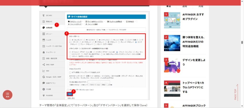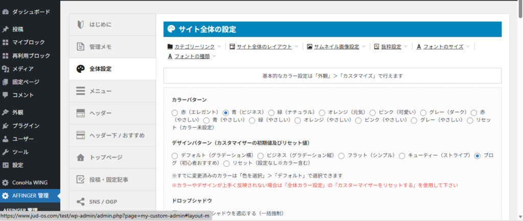 AFFINGER6は、インストール直後の時点ではレイアウトや配色が未設定の状態でした。そのため、最初にサイトカラーを選択し、最低限のデザインを整える工程が発生します。