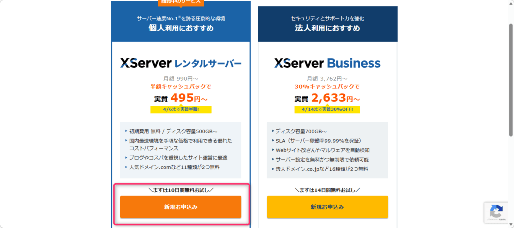 左側のXserverレンタルの新規お申込みボタンをクリックします。