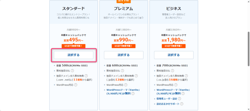 プランを選択します。個人ブログの場合は、スタンダードプランを選べば十分です。通常のブログ運営であれば、スタンダードでも性能は余裕があります。