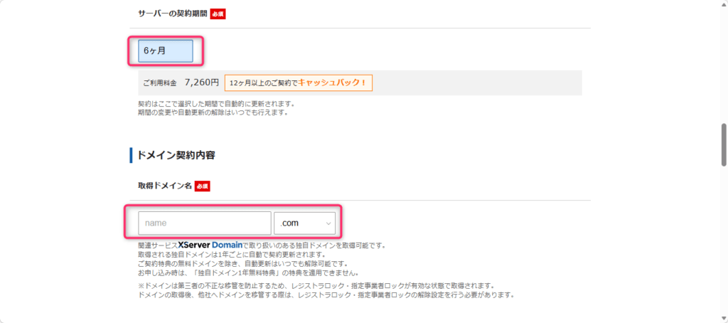 料金プランを選びます。セルフバック対象の6か月を選択してください。その後、ブログのドメイン名を入力します。