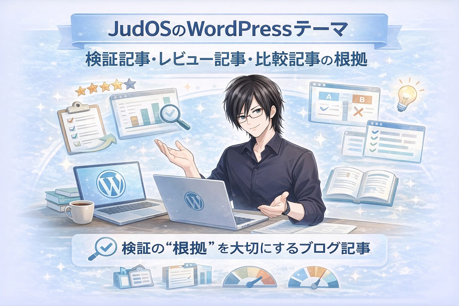 このページでは、JudOSがどんな考え方でWordPressテーマの検証・レビュー・比較記事を書いているのかをまとめています。